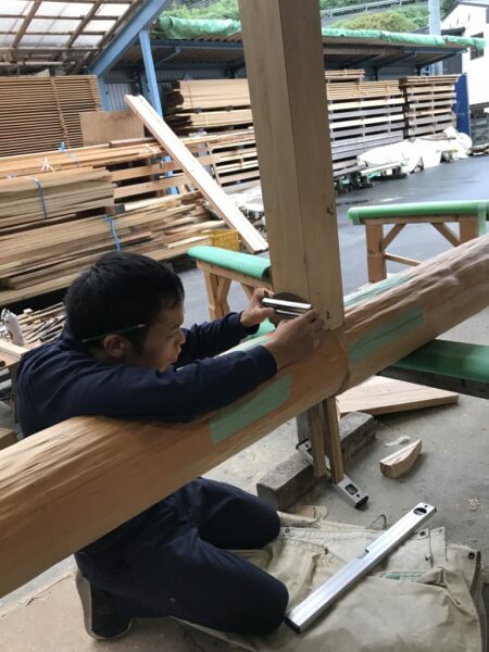 丸桁西渕工務店のこと2018年 10月 15日 (月) なんだこれは…! ってことで、丸桁なんですけども刺さっているのは柱で、これは本当は180度反対なんですね☺ ということで棟梁・中ちゃんと若手のせいやが共同作業で切り組みを行っておりました。 丸いものに取り付けるので結構やばいそうですよ。 うん、素人目に見ても難しそうだ。 中ちゃんはその反対側で、L字に組まれる部分の切り組み。 これまた難しそうだ。 « 次の記事へ一覧へ戻る前の記事へ »