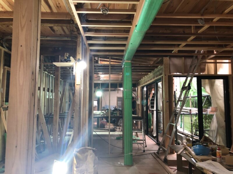 劇的西渕工務店のこと2019年 10月 17日 (木) 大洲で、リフォーム工事を行っています。 間取りを入れ替えたりしてるんですけど、中庭をつくってみました。 緑の養生スポンジのところは新しく入れた梁と柱です。 で、天井を新しくつくろうとしています。 劇的!になるかどうかはわかりませんが、地道にやっていってます。 « 次の記事へ一覧へ戻る前の記事へ »
