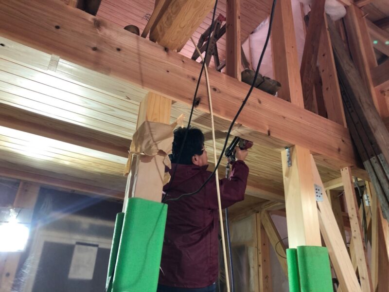 天井未分類2020年 01月 20日 (月) 大洲市肱川町『風、再び和む家』 天井板を貼っているところです。 洗面脱衣室です。 壁がないので作業が良く見える! 順番としては、 躯体→天井→床(仕上げ)→壁という順番で工事していきます。 « 次の記事へ一覧へ戻る前の記事へ »
