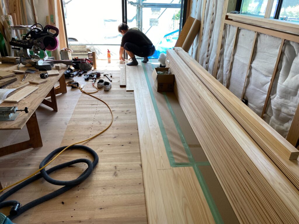 フローリング張(仮)南吉田の家2025年 09月 22日 (月) 松山市「(仮)南吉田の家」 フローリングを張ってます!!いえい! 桧ですね。 端から順に板を並べて、実(さね)と呼ばれる突起を溝に向いて押し込んでいきます。 詰め詰めに詰めます。 « 次の記事へ一覧へ戻る前の記事へ »