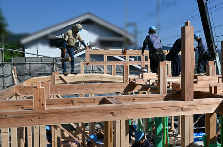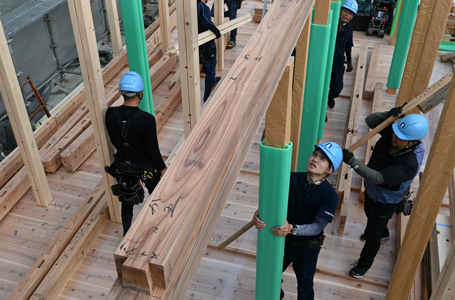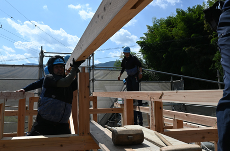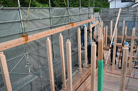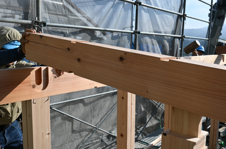 まずは柱を立てていき、その上に横架材(梁や桁)を納めます。