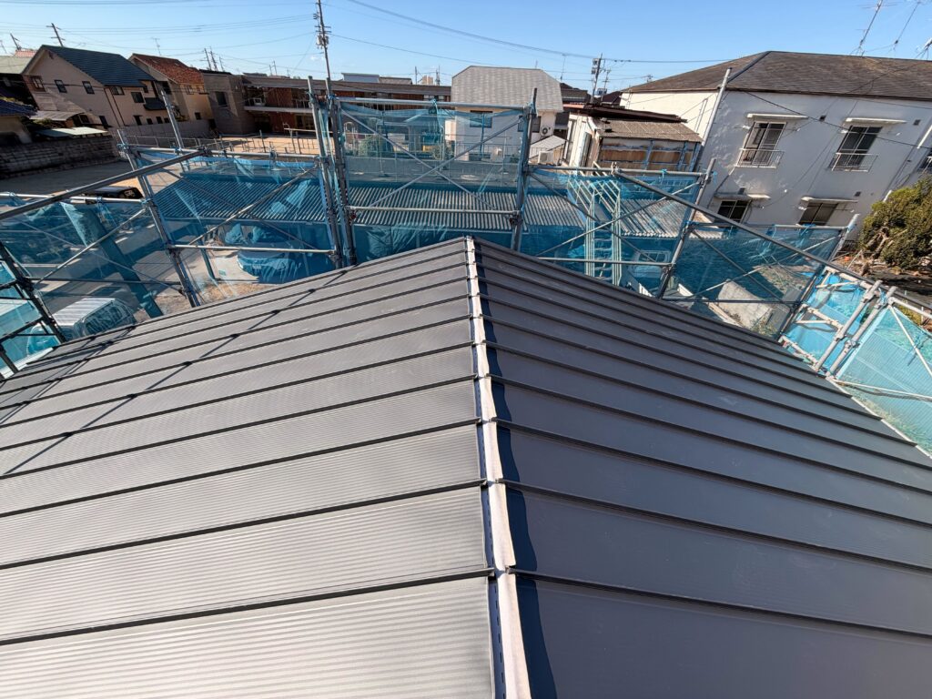 屋根葺く光あふれる、風薫る家2025年 12月 09日 (火)先月末に上棟した松山市来住町「光あふれる、風薫る家」 屋根の板金葺き。 なんでものによって動詞が違うんでしょうね。手の動きが違うからですか? 屋根は葺く(ふく)。 ガルバリウム鋼板、よくみんな「ガルバ」と呼んでいる材料です。 亜鉛とかアルミの合金です。 軽くてすっきり見えます。 篏合式といって、嵌(は)めていくんですけど、なんていうんですかね、噛み合わせていきます。 ここに更に棟を上からかぶせます。 « 次の記事へ一覧へ戻る前の記事へ »