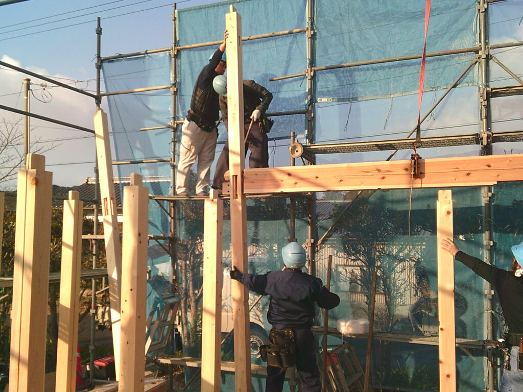みんなで一気に柱を立てていきます。四隅には通し柱。