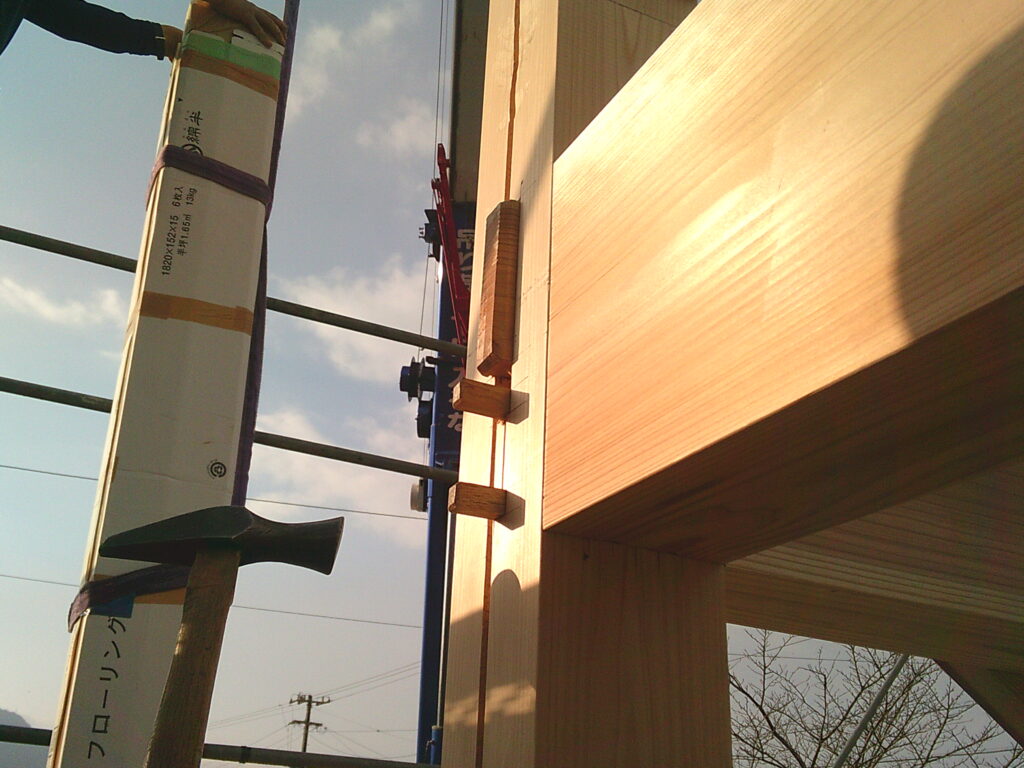 ほそ穴のところに2階の床梁(胴差)を納めます。通し柱の胴部分に取りつくので胴差と呼びます。
