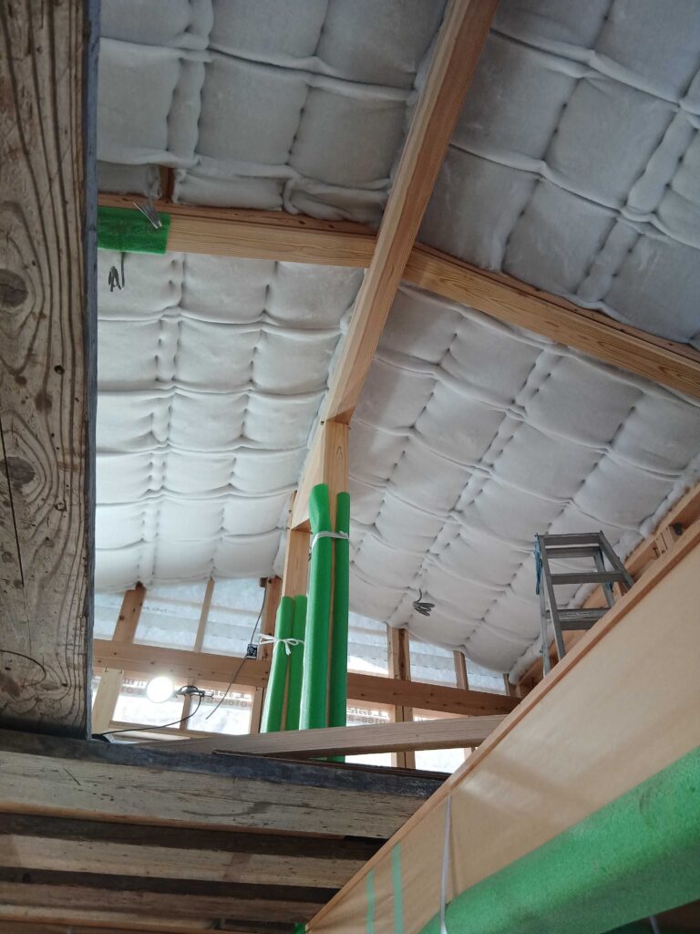 天井に断熱材を入れていきます。