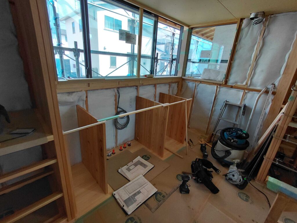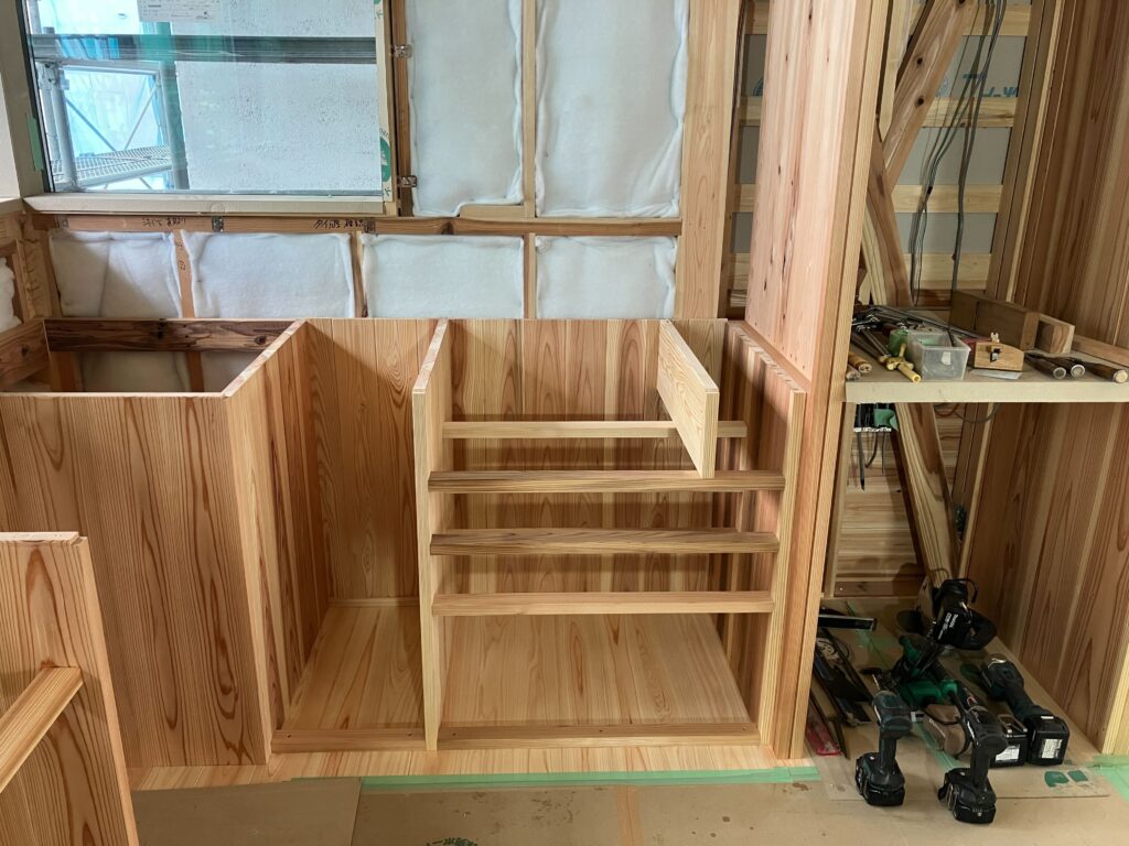 大工さんの仕事も大詰めでして、造作家具をつくってます。