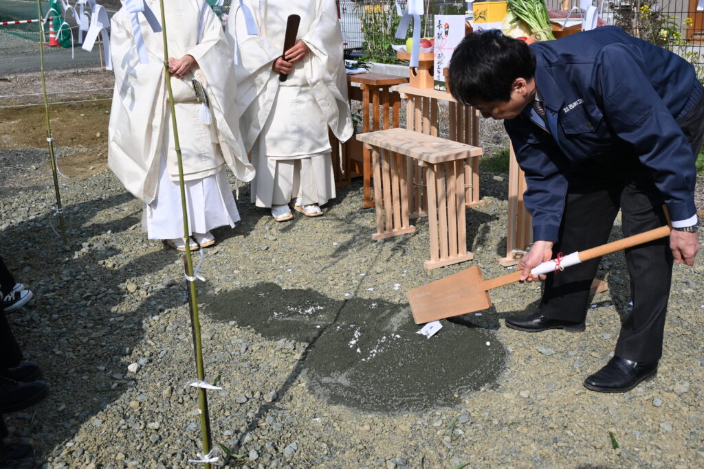 四方を祓い、そして、初めて着工するという儀式。お施主様が鍬入れ、施工者が鋤入れを行います。(写真)