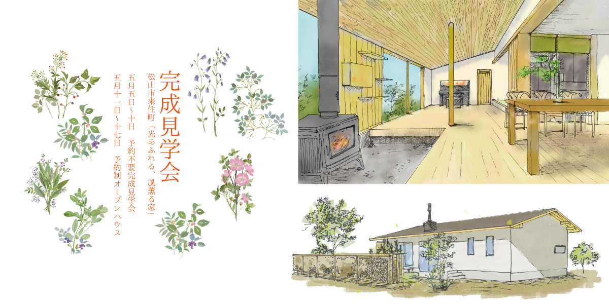 見学会!光あふれる、風薫る家2026年 04月 16日 (木)HPを更新しまして、5月のイベント情報です。 松山市来住町「光あふれる、風薫る家」にて 5/5~10 完成見学会(予約不要) 5/11~17 予約制オープンハウス を開催します。 初のGW開催です。 お時間ありましたらぜひ遊びにお越しくださいませ。 詳しくはこちらから。 現場は外回りの工事を行っておりまして、お施主様が庭木を植えておられました。 パースと同じ角度。 庭木も一緒? 青空にそとん壁の外壁が映えております。 ぜひぜひご来場くださいませ~。 一覧へ戻る前の記事へ »