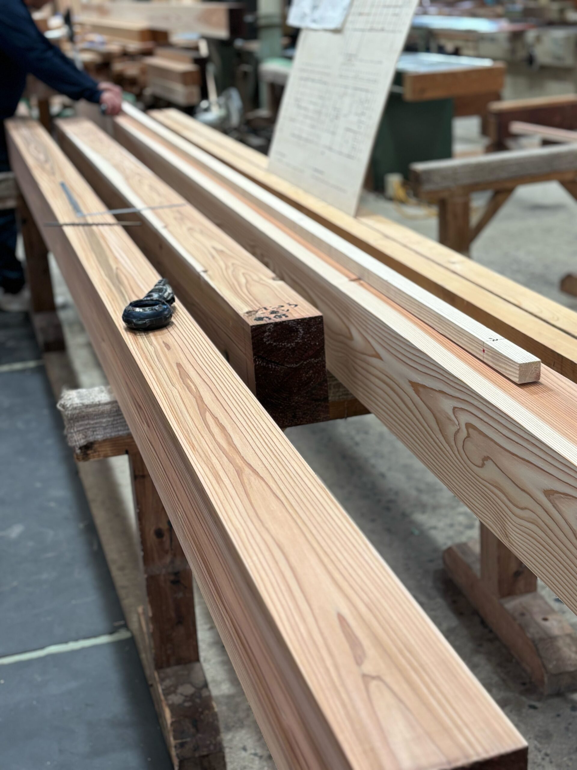 墨付けよ大洲の家2026年 04月 18日 (土) 大洲市「大洲の家」 杉の梁とか桁とかの横架材。 大工さんによる墨付けが始まっております。 一本一本墨を付けていって、それに従って刻みが始まっていきます。 木材の上にあるひときわ細い木材は「尺杖(しゃくづえ)」。 この家のための物差しです。サッシの高さとか桁高とか統一された寸法を書いておけばとっても便利な物差しになります。 一覧へ戻る前の記事へ »