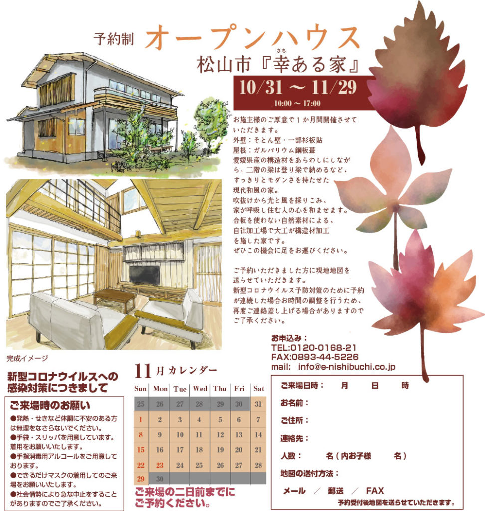 2020/10/23【10/31~11/29】松山市・予約制オープンハウスを開催します。 松山市『幸ある家』にて、予約制オープンハウスを開催します。 10/31~11/29 予約状況によりお時間の変更をお願いする場合がありますのでご了承ください。 上記をご確認いただき、こちら(リンク)もしくはお電話・FAXからお申込み下さい。 詳細はこちら« 次の記事へ一覧へ戻る前の記事へ » イベント 施工事例 お問い合わせ お電話 TOP