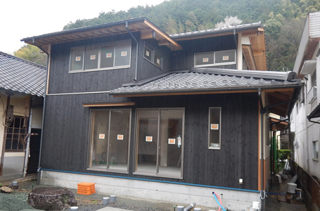 ついに『風、再び和む家』が完成しました! 漆喰と杉板貼の和の外観です。