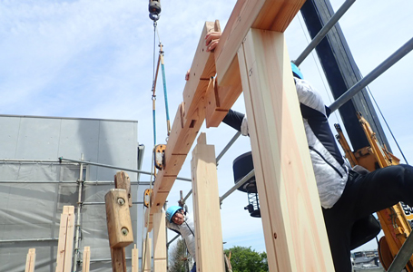 家の四隅の角に「通し柱」と呼ばれる1階から2階までの長さの柱が建てられます。 その真ん中に横架材、2階の床組となる「胴差」と呼ばれる部材を納めます。