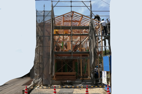 無事、棟が納められました。 総二階建ての外観が姿を現しました。 お施主様にはたくさんのお心遣いをいただき誠にありがとうございます。 スタッフ一同、よりよい家になりますよう精いっぱい尽力して参ります。