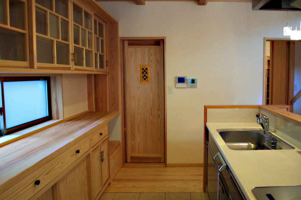 陽だまりの家松山市吉藤二階建て和瓦葺き塗り壁板張り壁薪ストーブ2012年竣工。 東側の前面道路へ向かって下屋の大きな庇が流れる。 三角形の形状に張り出したダイニングとデッキが軽やかな変化をもたらす。 無双窓の建具が和室を仕切る。 手づくりのガラスやタイルが鮮やか。 ※画像をクリックすると拡大表示します « 次の記事へ一覧へ戻る前の記事へ »